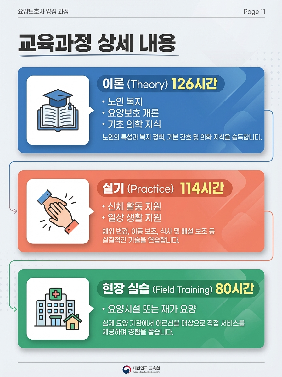 - 이론: 126시간 (노인복지, 요양보호개론, 의료 및 간호지식 등)