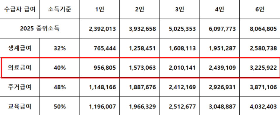 의료급여수급권자가 되기 위해서는 정부에서 정한 일정 소득과 재산 기준을 충족해야 합니다. 2025년 기준은 다음과 같습니다.