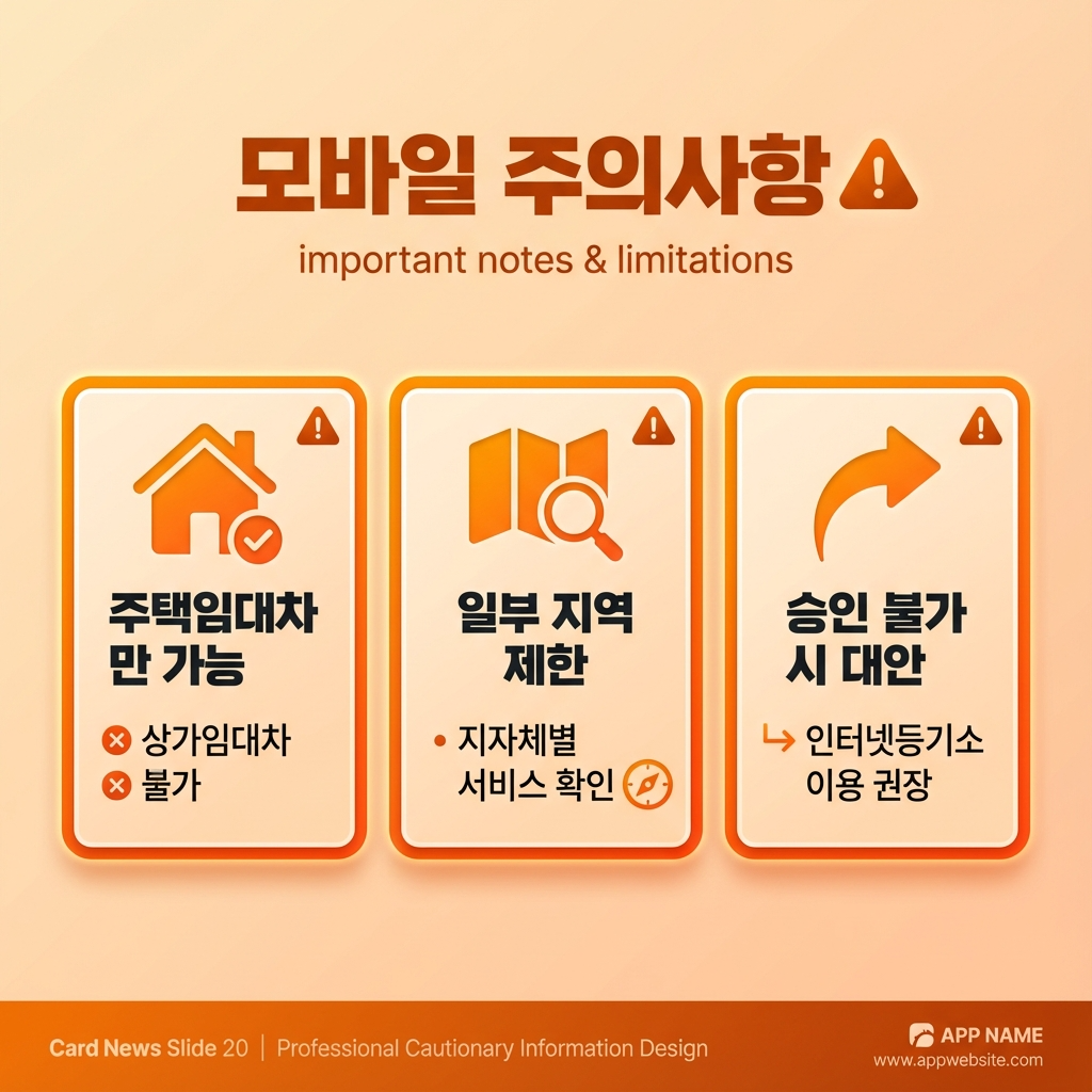 주의사항: 모바일 앱은 주택임대차만 가능하며, 일부 지자체에서는 서비스가 제한될 수 있습니다. 승인이 안 될 경우 인터넷등기소를 이용하시는 것을 권장합니다.