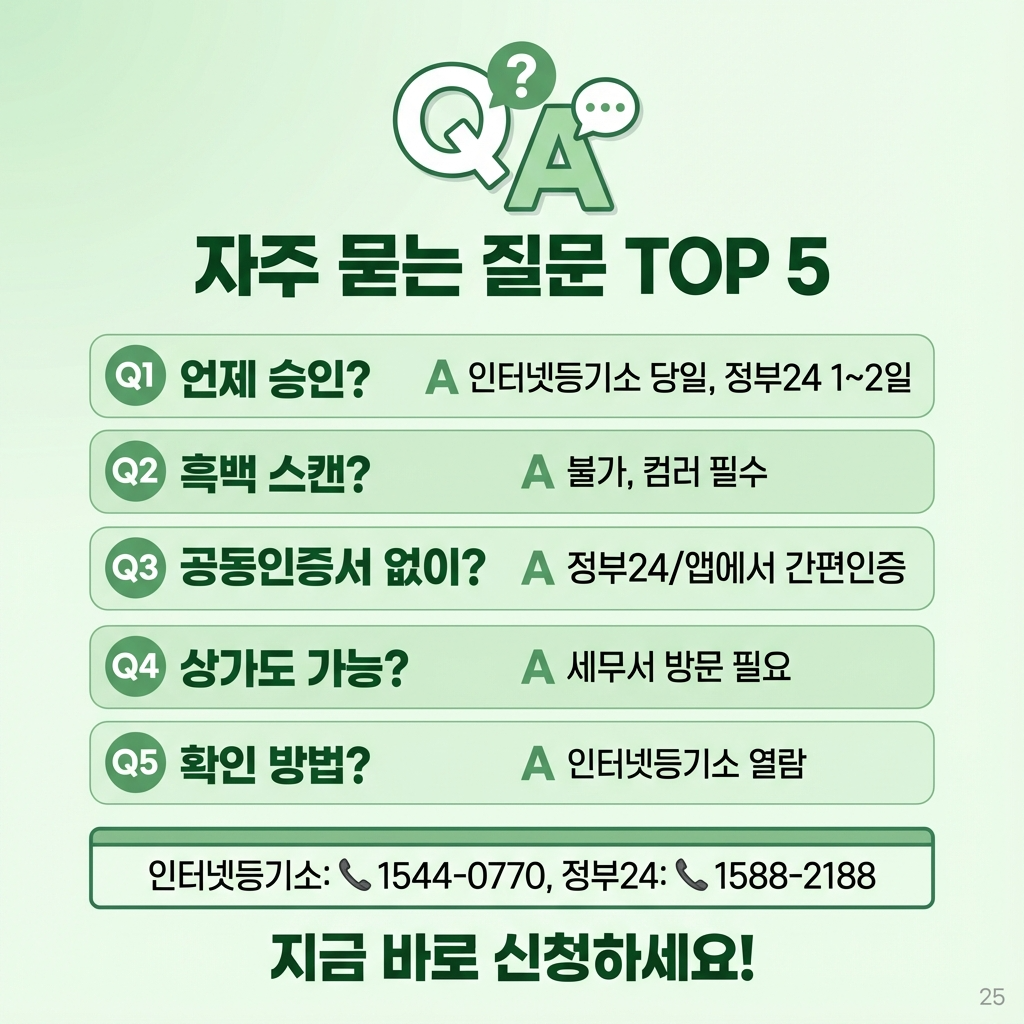 A. 인터넷등기소는 당일 처리가 원칙입니다. 평일 업무시간(09:00~18:00) 내 신청 시 당일, 퇴근시간 이후나 주말 신청은 다음 업무일에 승인됩니다. 정부24는 1~2일 소요됩니다.