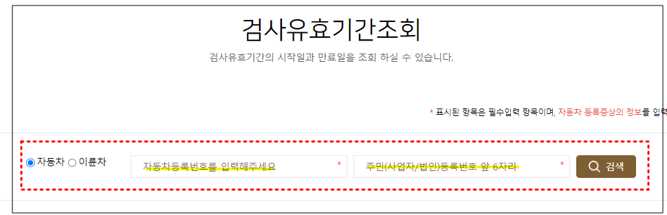 2. 검사유효기간조회 창 '자동차등록번호, 소유주 생년월일 앞자리' 입력