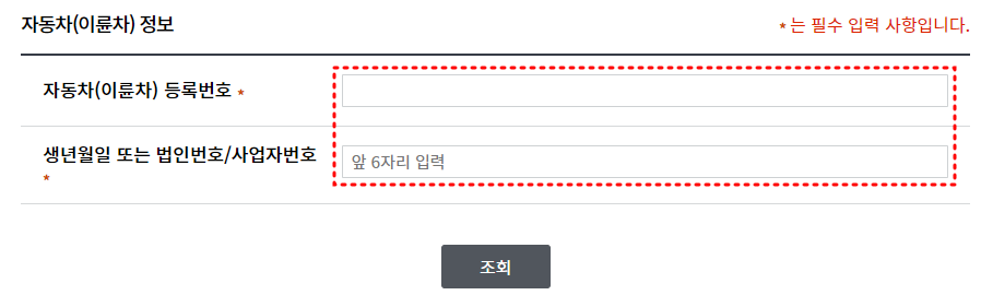 정보입력시에는 반드시, 자동차 등록증상에 표시되어있는 정보를 입력해야만 원활한 조회를 할 수 있습니다.