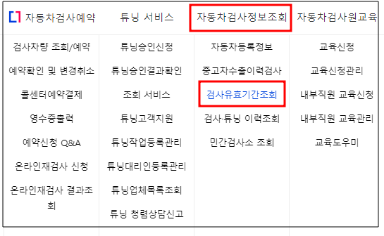 1. 사이버검사소 홈페이지 접속 후 '자동차검사 정보조회 > 검사유효기간조회' 선택
