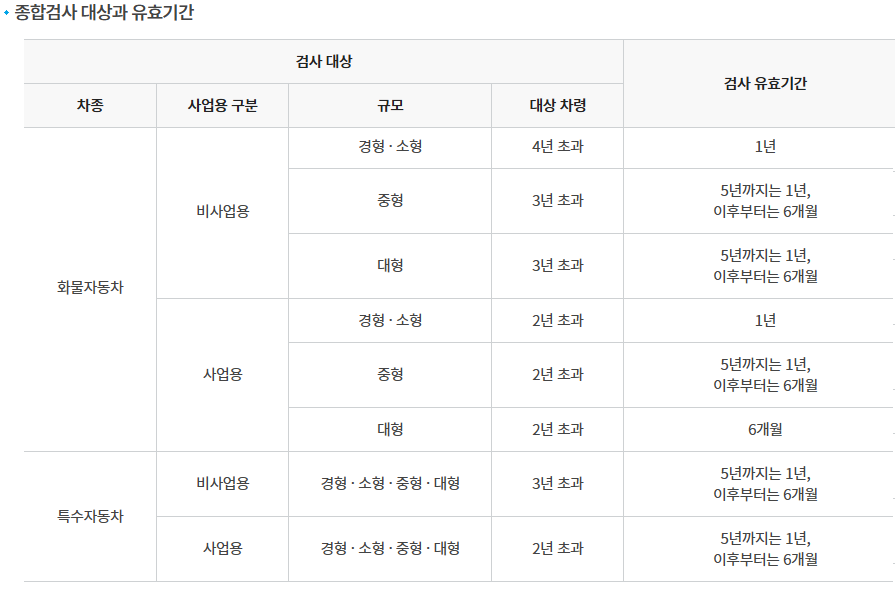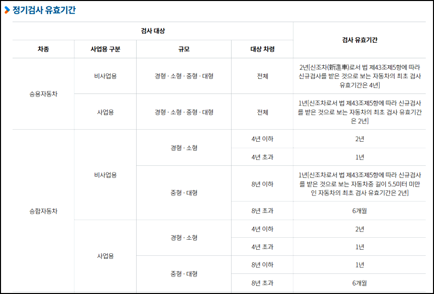 사업용 차량이나 대형 차량의 경우, 사용 빈도가 높은편이라 더 자주 검사를 받게 됩니다. 승합차나 화물차의 경우 신차 출고 후 2년이 지나면 첫 검사를 받고 이후에는 1년마다 검사를 받아야 합니다.