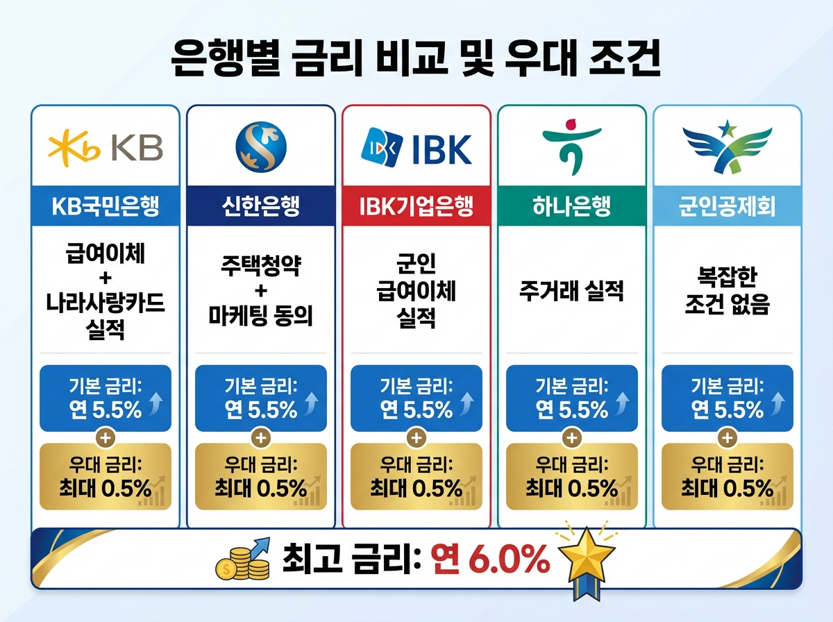 이번 적금은 KB국민은행, 신한은행, IBK기업은행, 하나은행, 군인공제회 등 5개 기관이 참여합니다. 기본 금리는 연 5.5%로 동일하지만, 은행별로 0.5%의 우대금리 조건이 다릅니다. 나에게 유리한 은행을 선택하는 것이 중요합니다.