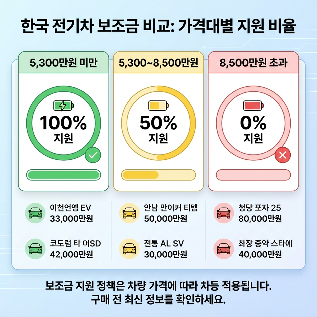 - 차량 가격 기준 명확화: 5,300만원 미만 전액 지원, 5,300만~8,500만원 미만 50% 지원