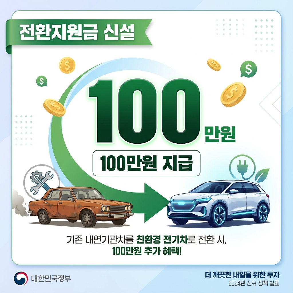 - 전환지원금 신설: 내연기관차를 폐차하거나 판매한 후 전기차를 구매하면 최대 100만원 추가 지원