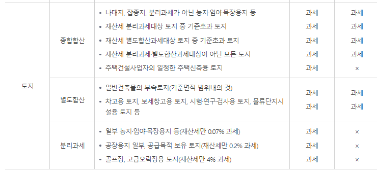 종부세 과세대상은 주택, 종합합산토지, 별도합산토지로 구분되며, 과세기준일에 다음과 같은 기준에 이상인 부동산을 소유하고 있는 경우 대상이 됩니다.