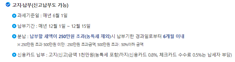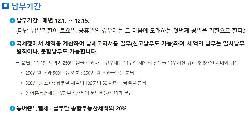 종부세 납부시기는 매년 12월 1일부터 12월 15일까지이며, 납부기한 마지막 날이 토요일이나 공휴일인 경우, 돌아오는 첫 번째 평일이 기한이 됩니다.
