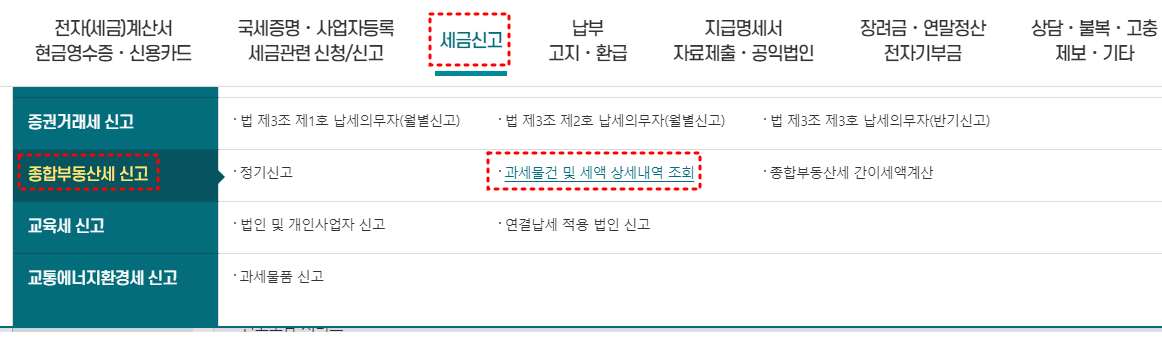 종부세 과세대상 조회는 '세금신고 > 종합부동산세 신고 > 과세물건 및 세액 상세내역 조회'를 통해 확인할 수 있습니다.