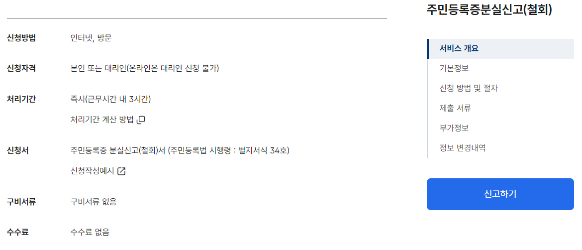 시간 여유가 없는 분들이라면, 온라인으로 주민등록증 분실신고 서비스를 이용해보세요. 해당 서비스는 정부24를 통해서 신청할 수 있습니다.