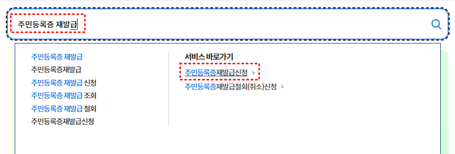 1. 정부 24 홈페이지 접속 후 검색창 '주민등록증 재발급' 검색