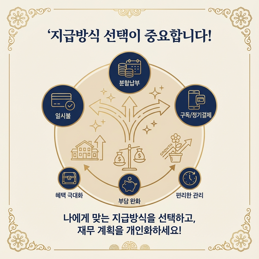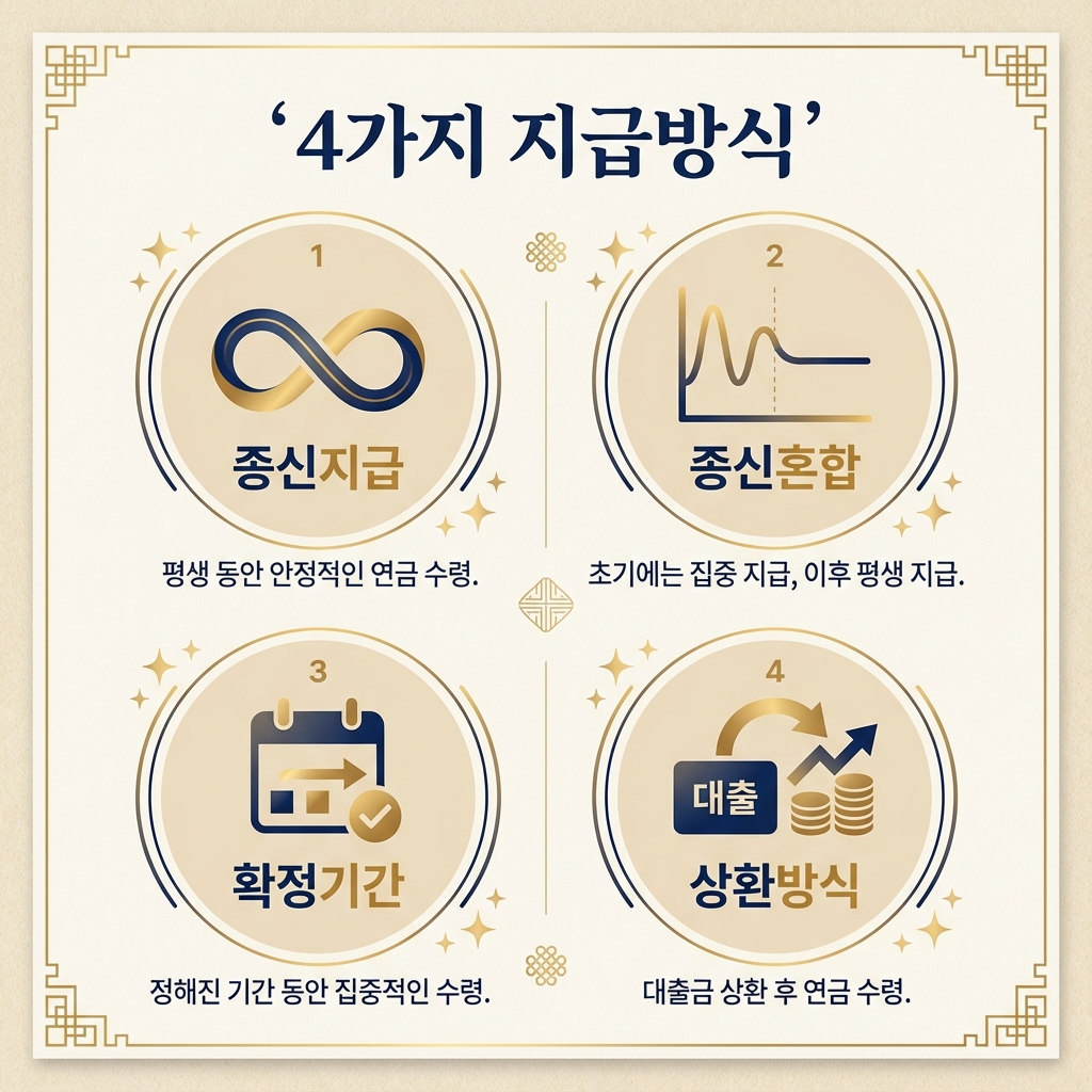 주택연금 수령액 계산에서 또 하나 중요한 선택이 바로 지급방식입니다. 한국주택금융공사는 다양한 지급방식을 제공하고 있으며, 각 방식마다 주택연금 수령액이 달라집니다. 본인의 노후 자금 필요 패턴에 맞춰 최적의 방식을 선택하는 것이 중요합니다.