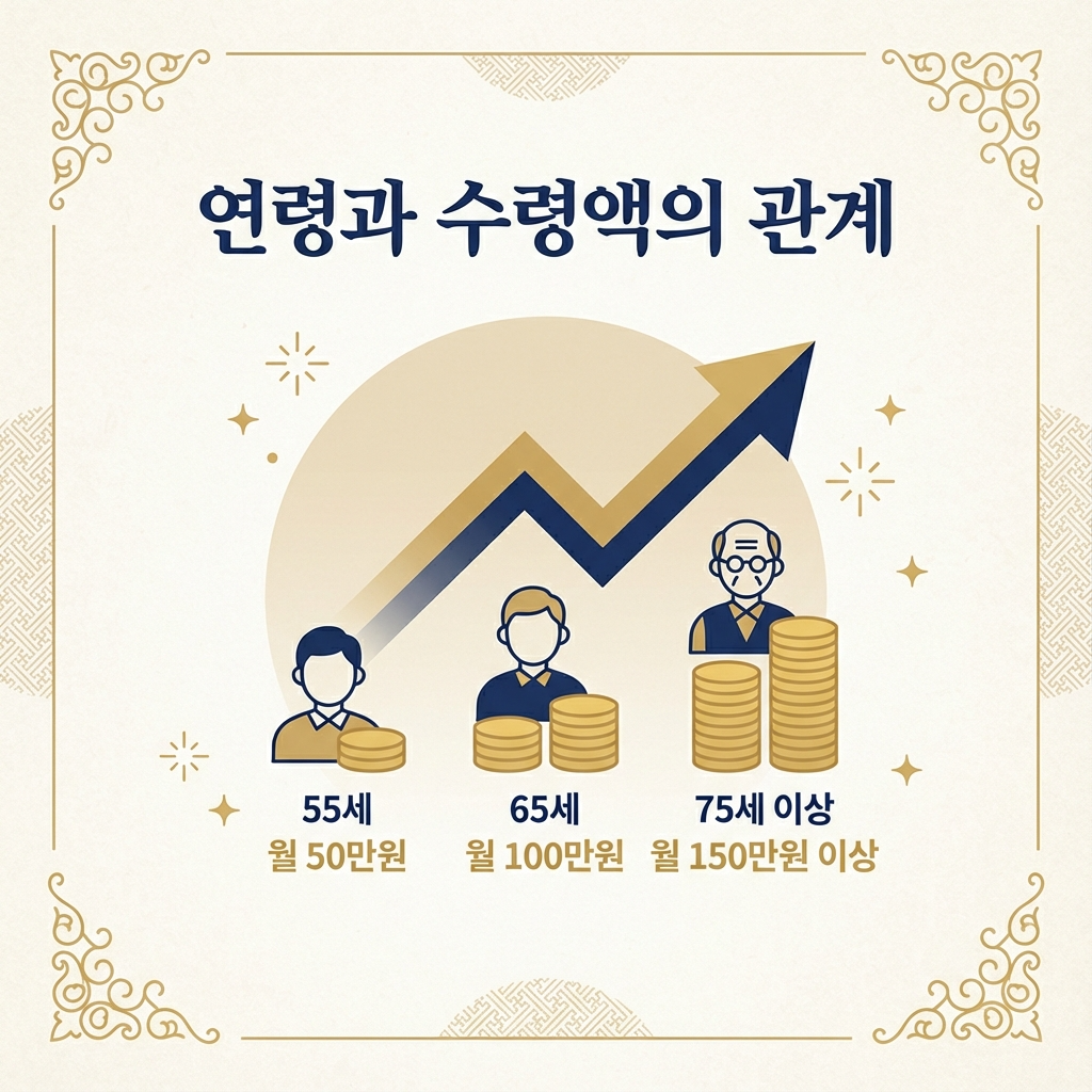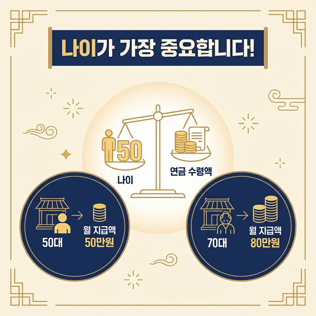• 배우자 연령: 부부 중 연소자 기준으로 계산되므로 배우자가 어릴수록 수령액이 줄어듭니다.