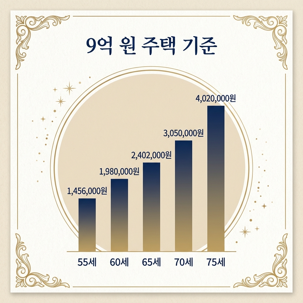 9억 원 주택 기준 연령별 주택연금 수령액 계산 (종신지급방식):