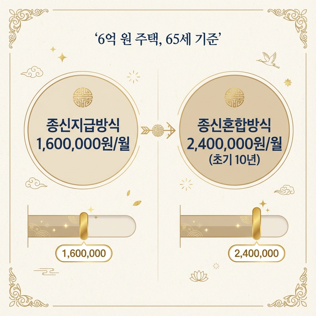 예를 들어, 6억 원 주택에 만 65세가 가입한다면, 종신지급방식은 월 약 160만 원, 종신혼합방식(초기 10년)은 월 약 240만 원을 받을 수 있습니다. 주택연금 수령액 계산기에서 각 방식을 직접 비교해보고 본인에게 맞는 최적의 방법을 선택하시길 권장합니다.