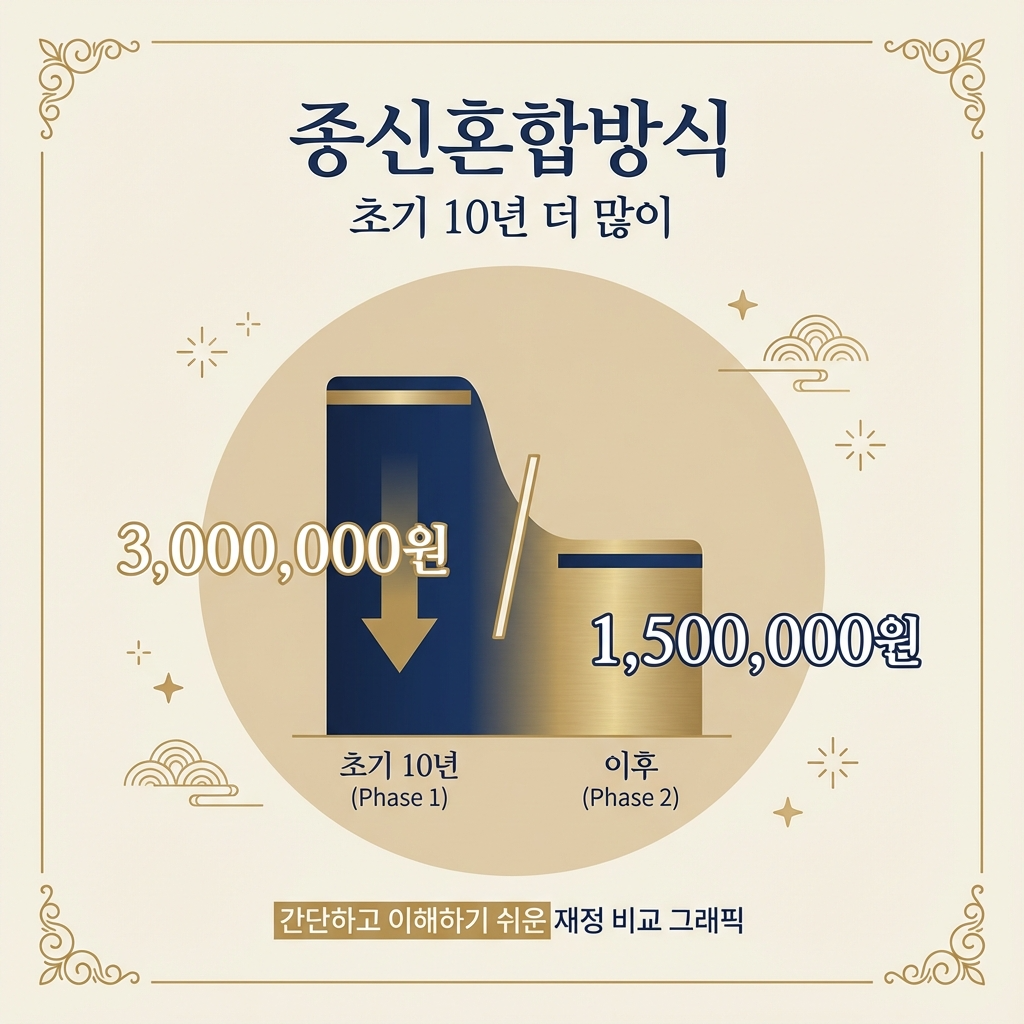 종신혼합방식 초기 10년간 더 많이 받고 이후 감액 초기: 월 300만원 / 이후: 월 150만원 (예시)