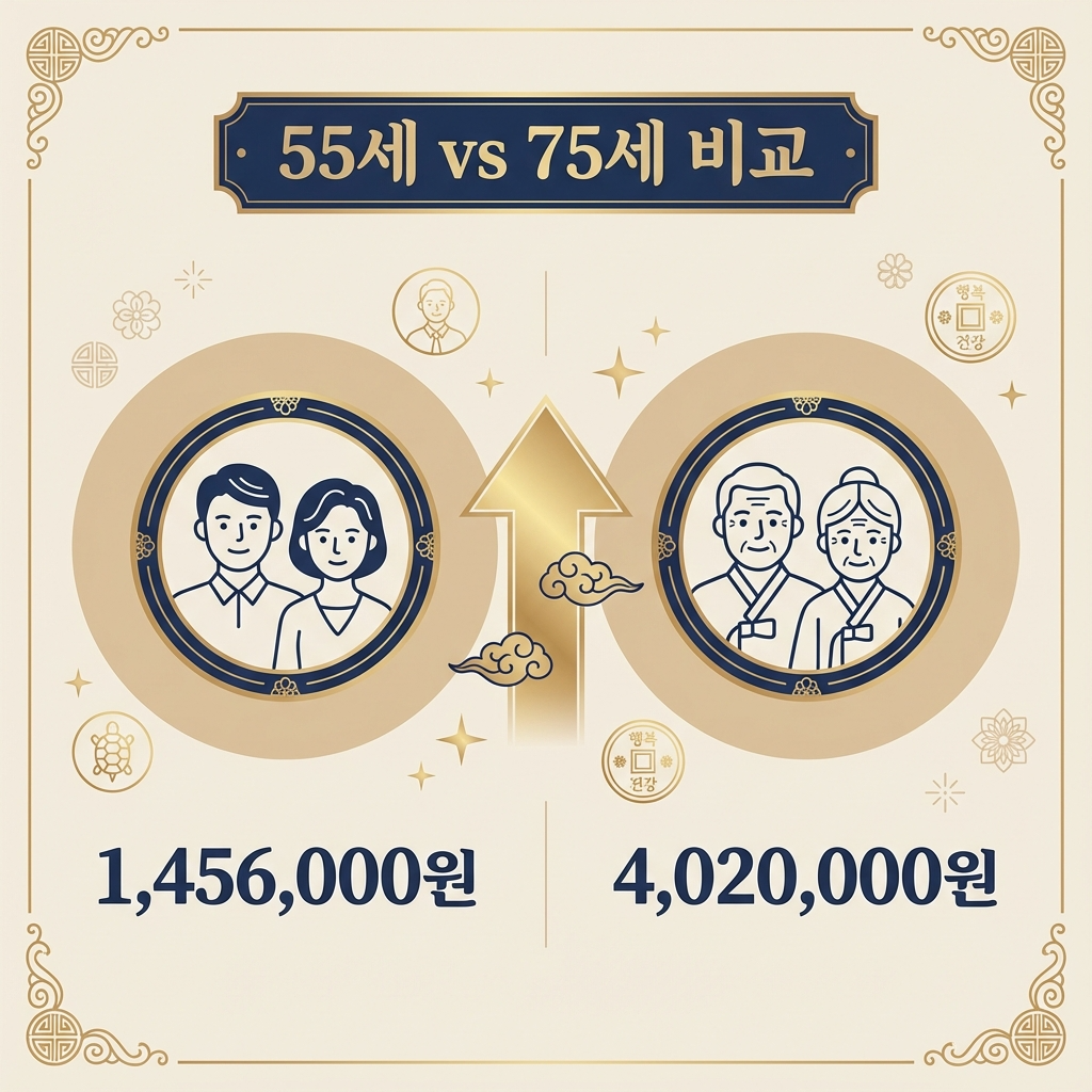 예를 들어, 55세부터 20년간 받으면 총 3억 4,944만 원인 반면, 75세부터 10년간 받으면 총 4억 8,240만 원입니다.