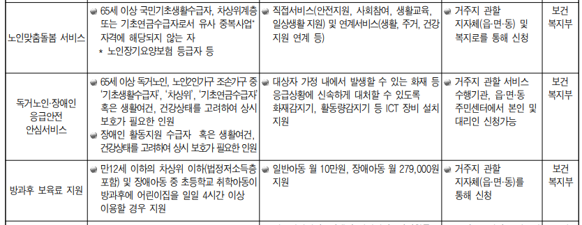 마지막으로, 돌봄 지원으로 간병인 서비스나 법률 자문 서비스 등이 있습니다.