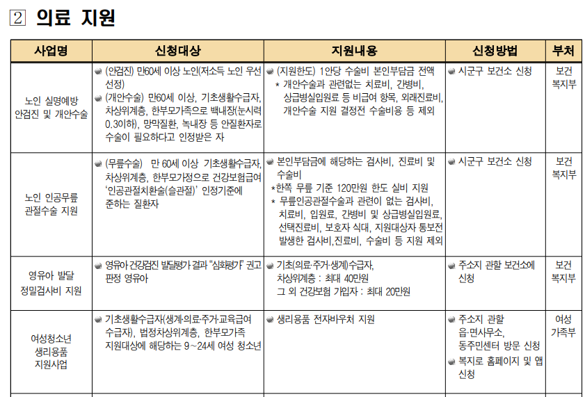 특히 소득이 줄어드는 노년층의 인공관절 수술비나, 임플란트 지원비 등은 차상위계층에게 큰 도움이 되는 의료지원 중 하나입니다.