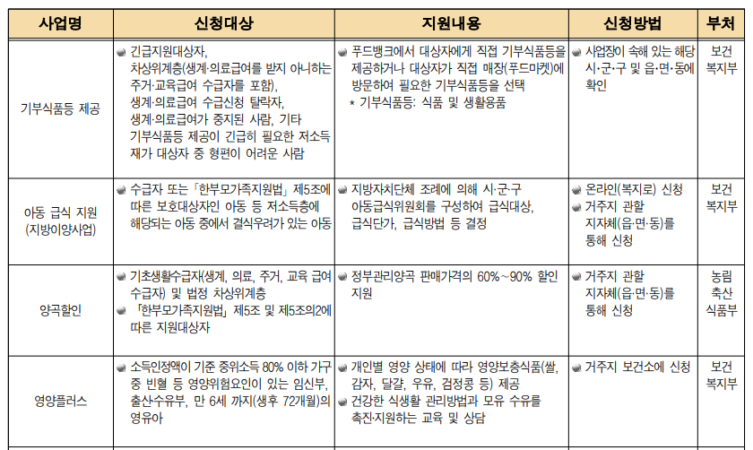 첫째로, 생계지원으로는 기본적인 생활을 유지할 수 있도록 자활근로, 푸드뱅크 식품 제공, 우유 및 아동급식 등이 있습니다.