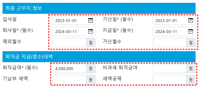 퇴직금 세금 자동계산기에 본인의 최종 근무지의 정보에 입사일, 퇴사일, 퇴직금 계산 시작일, 지급일, 퇴직급여, 비과세 퇴직급여, 기납부세액 등의 정보를 입력해 주면 됩니다.