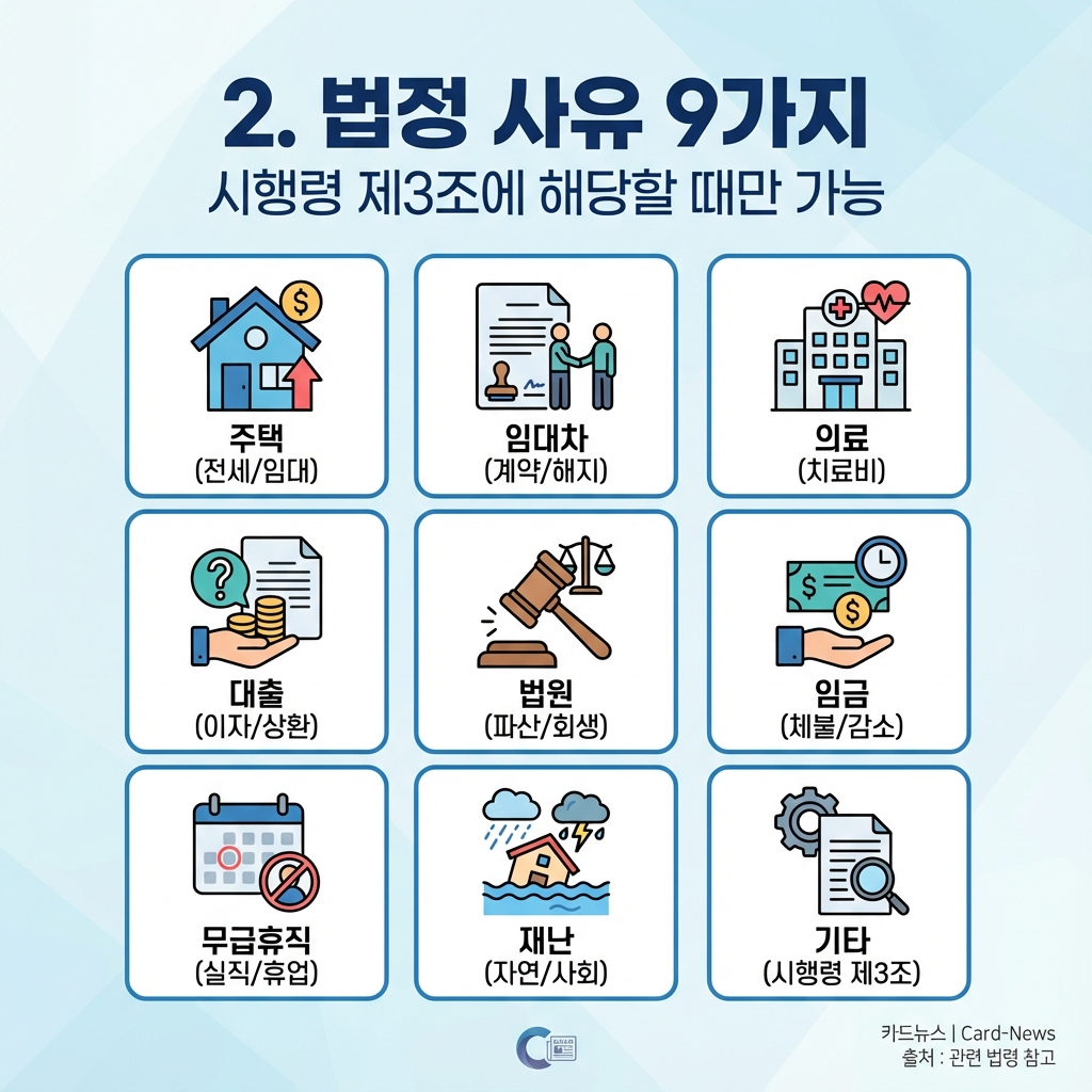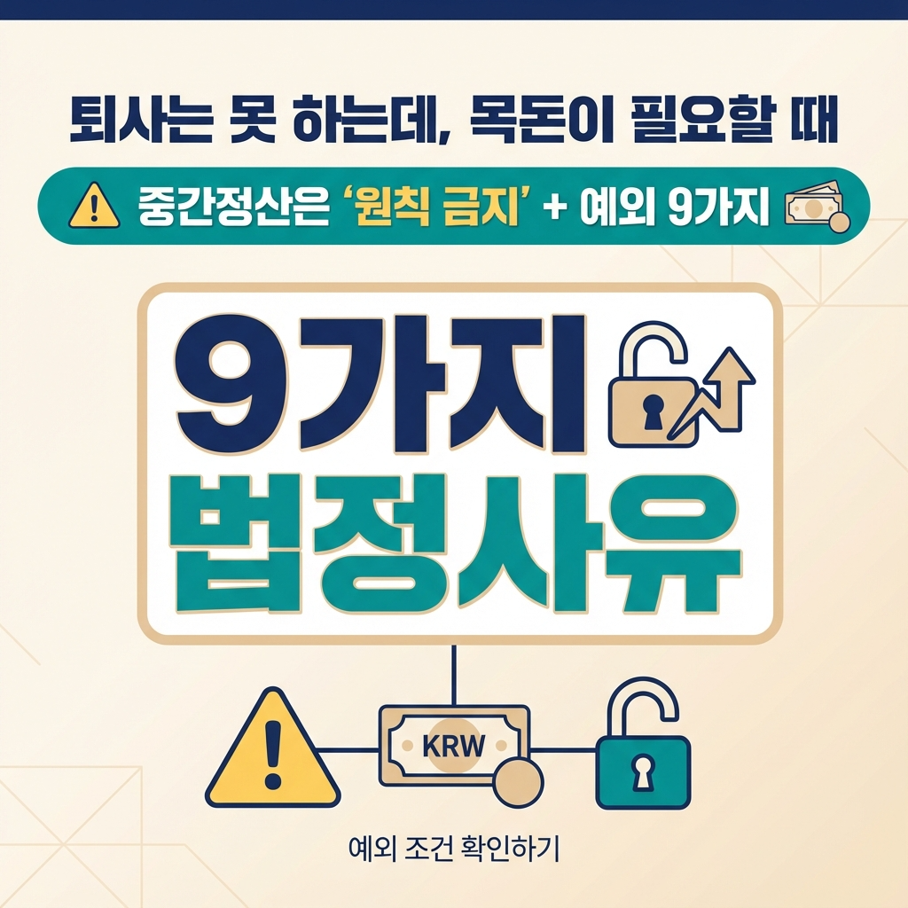 - 법정 사유: 근로자퇴직급여보장법 시행령 제3조에서 정한 9가지 사유 중 하나에 해당