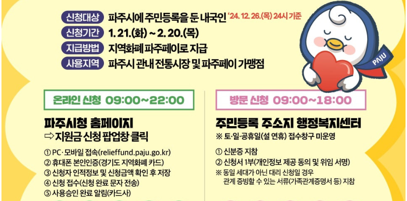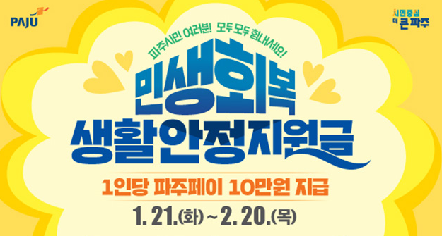 2025년 설 명절을 맞아 경기도 파주시는 시민들의 생활 안정과 지역 경제 활성화를 위해 민생회복 생활안정지원금을 지급합니다. 파주시민이라면 누구나 해당 지원금을 신청할 수 있으며, 지원금은 지역화폐인 파주페이로 개인당 10만원이 지급되니 지금 바로 신청하세요.
