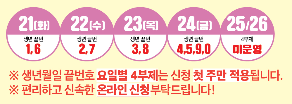 • 해당 요일 준수: 지정된 요일에만 신청 가능하므로, 혼란을 방지하기 위해 반드시 자신의 생년 끝자리를 확인하시기 바랍니다.