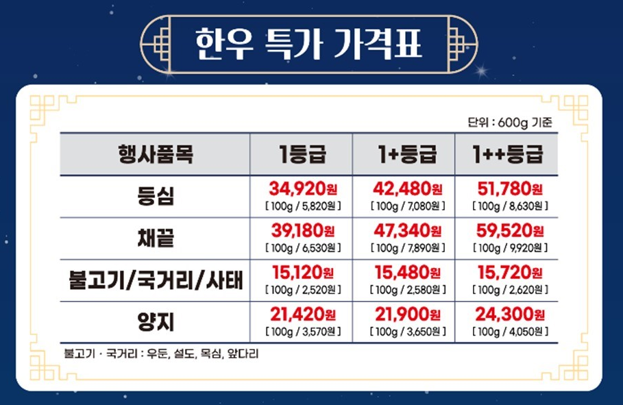 해당부위들은 한우에서도 최고급으로 여겨지는 부위로 평소에도 가격대가 높은 상품이지만, 이번 행사에서는 1++ 등급 한우 등심은 100g당 약 5,500원에서 6,600원에 판매됩니다.