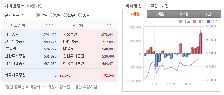 - 수급 특징: 2월 26일 기준 외국인(+39,482주), 기관(+19,547주)의 강력한 쌍끌이 매수가 포착되었습니다. 특히 외국인이 비싸진 가격에도 물량을 쓸어 담고 있다는 건, 그들이 보는 목표가는 지금보다 훨씬 높다는 뜻입니다. 개미가 털리고 메이저가 담는 전형적인 급등 패턴입니다.