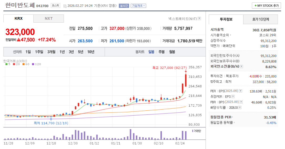 최근 국내 증시에서 가장 뜨거운 종목은 단연 한미반도체입니다. 2026년 2월 27일, 장중 327,000원을 터치하며 역사적 신고가를 다시 썼습니다. 이는 증권사들의 평균 목표주가인 23만 원대를 비웃기라도 하듯 거침없는 질주를 보여주는 대목인데요.