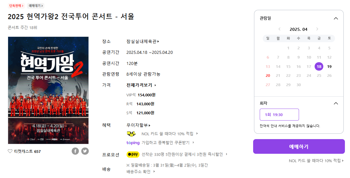 ※ 현역가왕2 콘서트 티켓 가격은 공연장 및 지역에 따라 약간의 차이가 있을 수 있습니다.