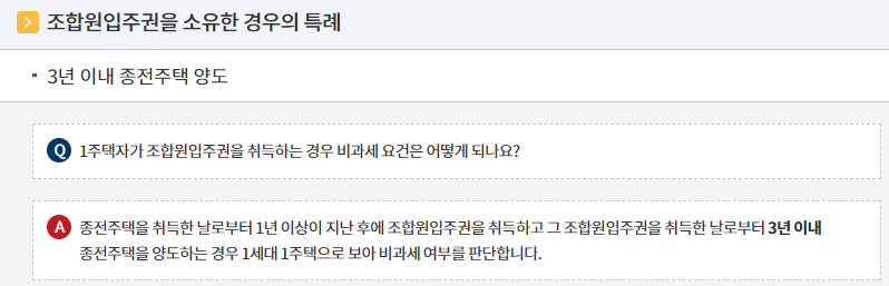 • 기존 주택의 매도 기한: 재건축이나 재개발로 인해 조합원 입주권을 취득한 경우, 입주권을 받은 후 3년 이내에 기존 주택을 매도해야 비과세 혜택이 적용됩니다.