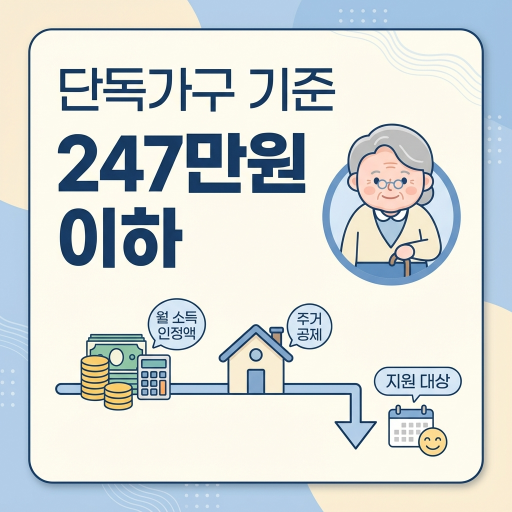 단독가구의 경우 월 소득인정액이 247만원 이하, 부부가구는 395만 2천원 이하면 신청할 수 있습니다. 이는 2026년 기준중위소득(256만 4천원)의 96.3% 수준까지 확대된 것으로, 더 많은 어르신들이 기초연금 혜택을 받으실 수 있게 되었습니다.