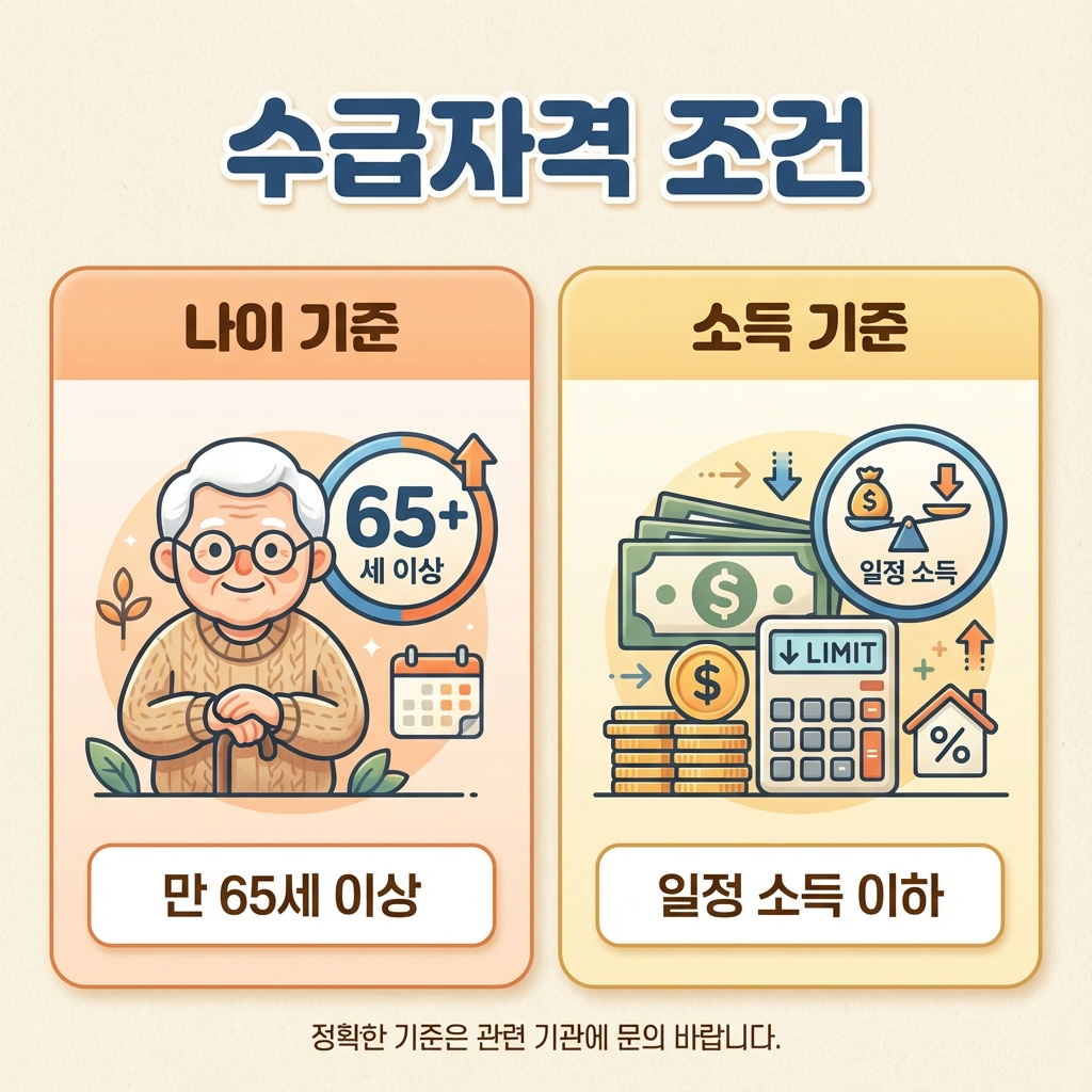 2026 기초노령연금 금액을 받기 위한 수급자격은 크게 두 가지 조건을 충족해야 합니다. 첫째는 나이 기준이고, 둘째는 소득인정액 기준입니다.