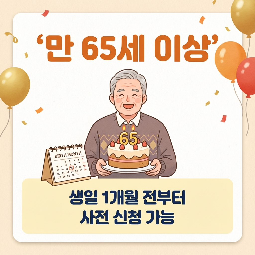 만 65세 이상 대한민국 국민이라면 누구나 신청 가능합니다. 생일이 속한 달의 1개월 전부터 사전 신청이 가능하니 미리 준비하시는 것이 좋습니다.