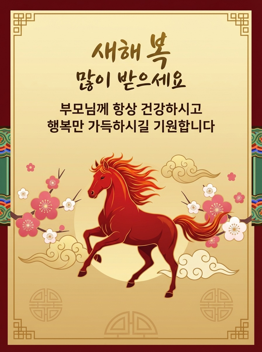 - 2026년 힘차게 달리는 말처럼, 우리 가족 모두 건강하고 활기찬 한 해가 되길 바랍니다. 부모님, 새해 복 많이 받으십시오.