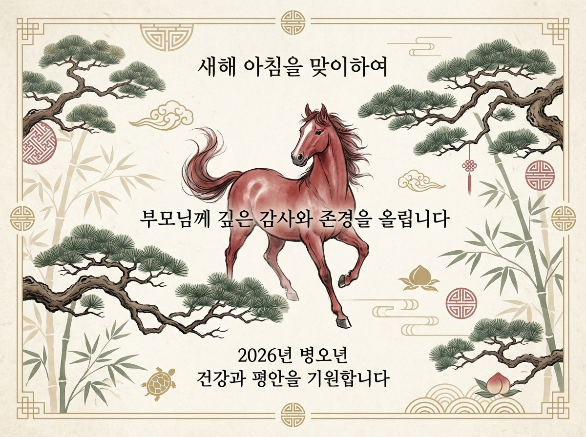 - 어머니, 아버지. 2026년 붉은 말의 해가 밝았습니다. 올 한 해도 두 분 더욱 건강하시고, 저희와 함께 웃을 일만 가득하셨으면 좋겠습니다. 사랑합니다.
