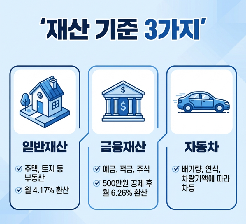 - 금융재산: 예금, 적금, 주식 등 (500만원 공제 후 월 6.26% 환산)