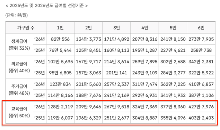 - 교육급여: 초·중·고등학생 교육활동지원비 지급 (연 1회)