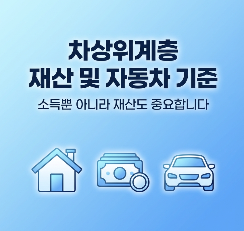 차상위계층 인정을 위해서는 소득뿐만 아니라 재산과 자동차도 기준을 충족해야 합니다. 재산은 일반재산, 금융재산, 자동차로 구분되며, 각각의 재산 종류에 따라 다른 환산율이 적용됩니다.
