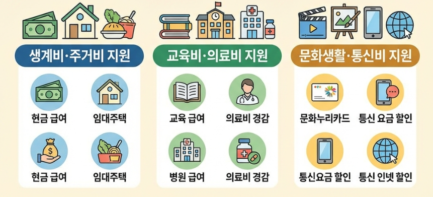 - 통합문화이용권: 1인당 연간 14만원 문화누리카드 지급 (2025년 기준)