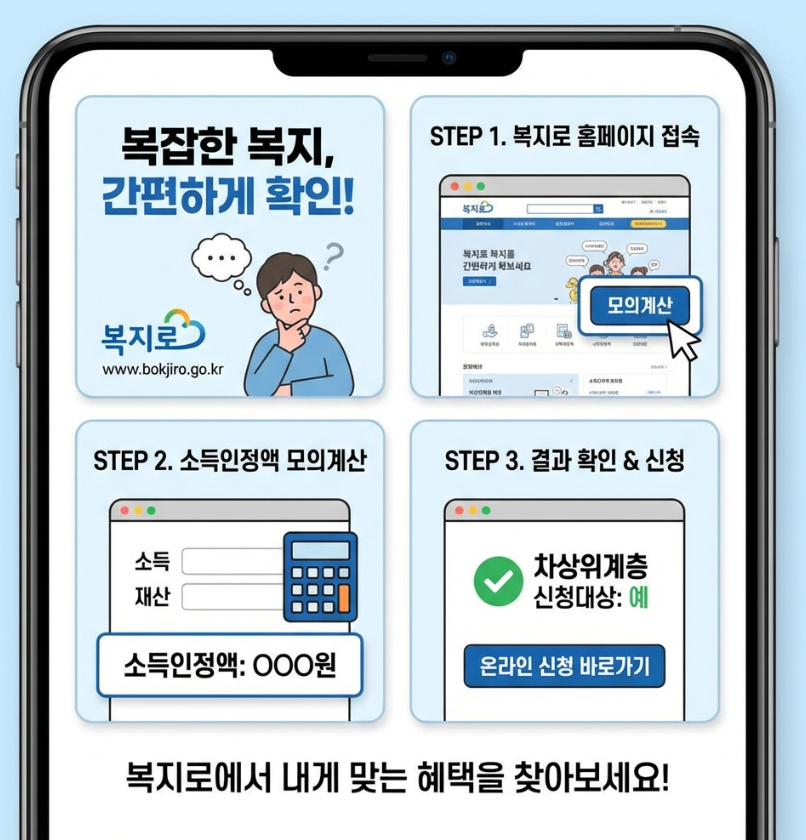 복잡하게 느껴지신다면 복지로(www.bokjiro.go.kr) 홈페이지에서 모의계산을 통해 간편하게 확인할 수 있습니다.