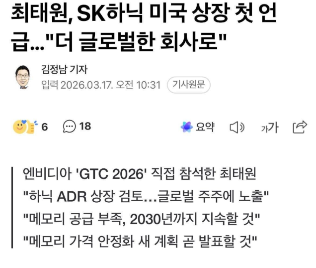 최태원 SK그룹 회장은 지난 3월 16일 미국 캘리포니아주 새너제이에서 열린 엔비디아의 연례 AI 컨퍼런스 'GTC 2026' 현장에서 기자들과 만나 "SK하이닉스의 ADR상장을 검토 중"이라며 "한국 주주뿐만 아니라 미국 및 글로벌 주주들에게 노출될 수 있어 더 글로벌한 회사가 될 것"이라고 공식 언급했습니다. 이는 그동안 풍문으로만 떠돌던 미국상장 계획을 처음으로 공개석상에서 인정한 역사적인 순간이었습니다.