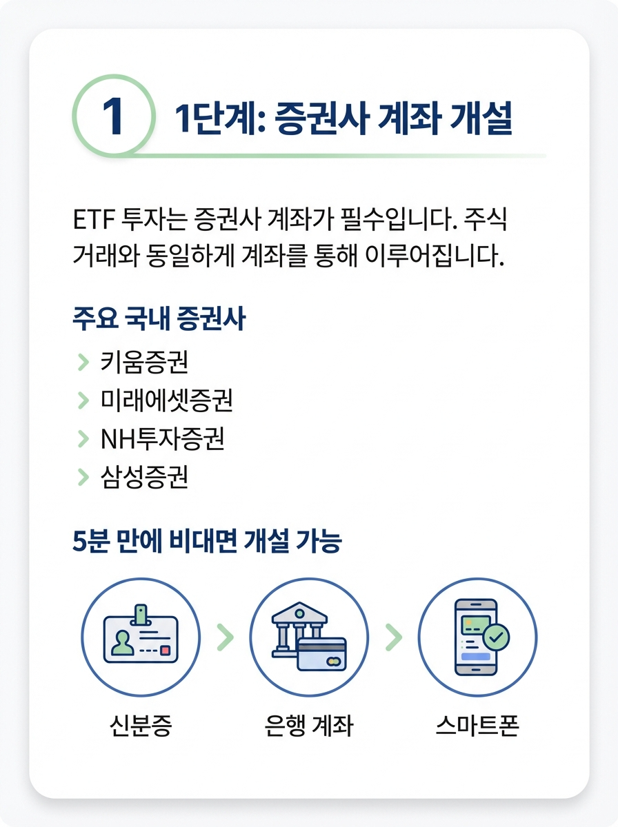 ETF는 주식처럼 거래되므로 증권 계좌가 필요합니다. 키움증권, 미래에셋증권, NH투자증권, 삼성증권 등에서 비대면으로 5분 만에 개설 가능합니다.