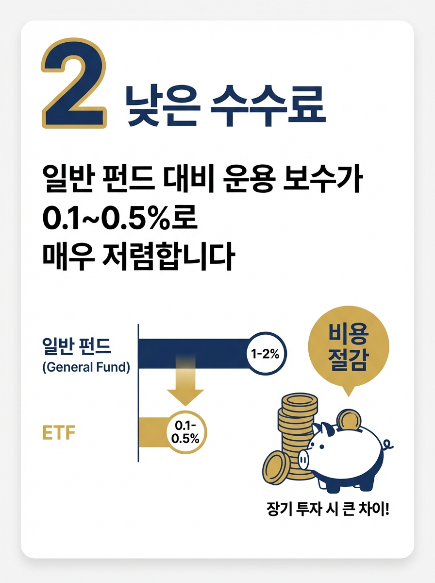 - 낮은 수수료 - 일반 펀드 대비 운용 보수가 0.1~0.5%로 매우 저렴합니다