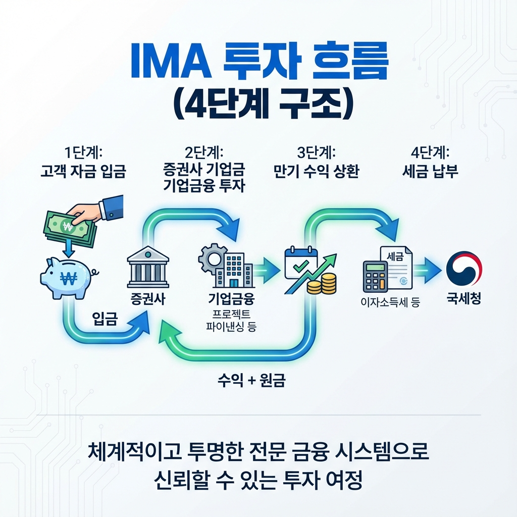 IMA 종합투자계좌는 'Investment Management Account'의 약자로, 증권사가 고객으로부터 예탁받은 자금을 기업금융(IB) 자산에 직접 투자하고 그 수익을 고객에게 돌려주는 실적배당형 상품입니다. 한마디로 증권사가 고객의 돈을 대신 운용해주는 종합투자계좌입니다.