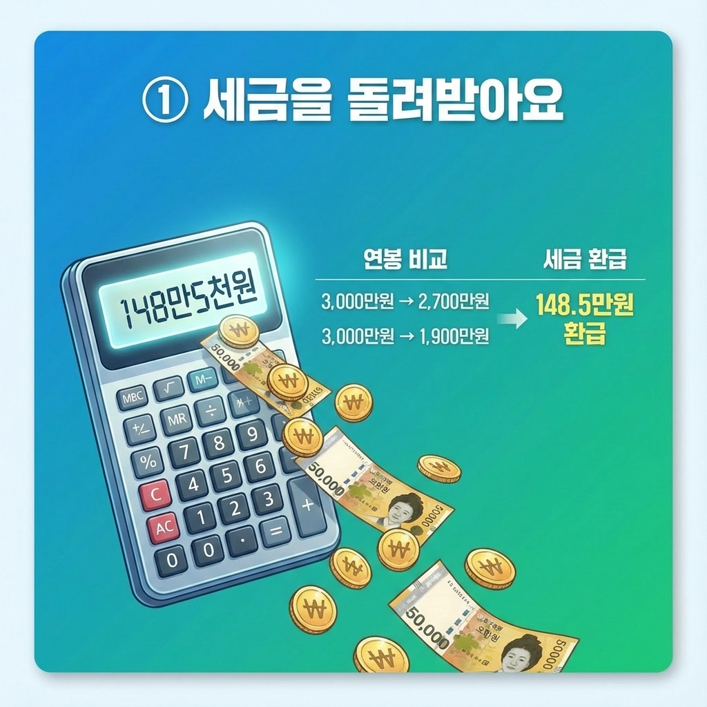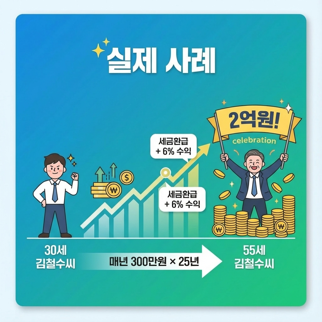 예를 들어 300만원만 넣어도 약 40~50만원을 세금으로 돌려받아요. 그냥 통장에 넣기만 했는데 돈이 저절로 늘어나는 거죠!