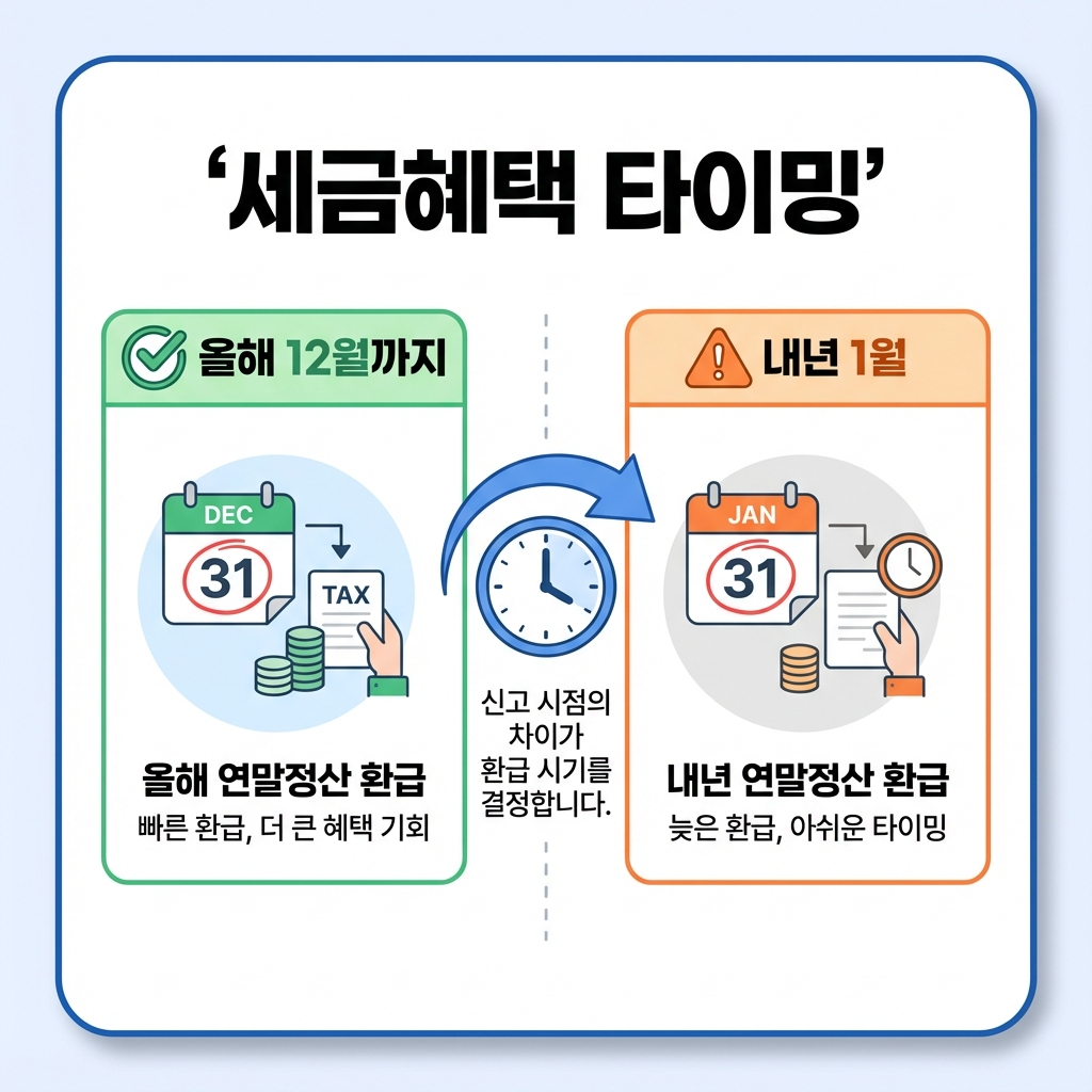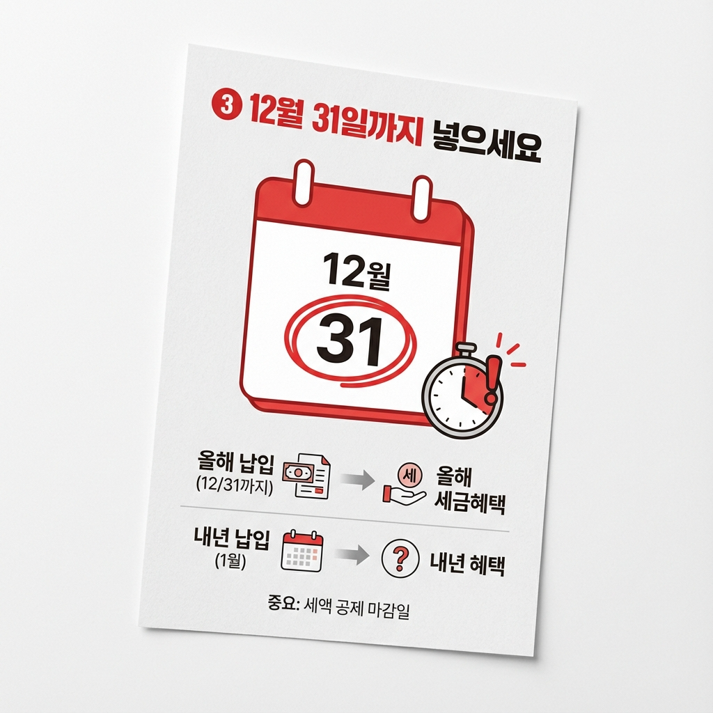 올해 세금 혜택 받으려면 12월 31일까지 넣어야 해요. 1월에 넣으면 내년 혜택이에요!